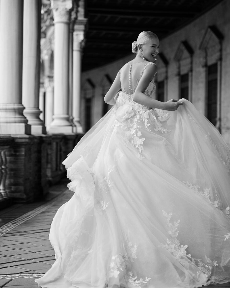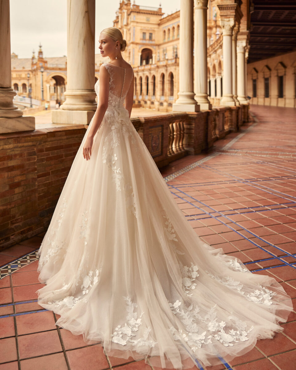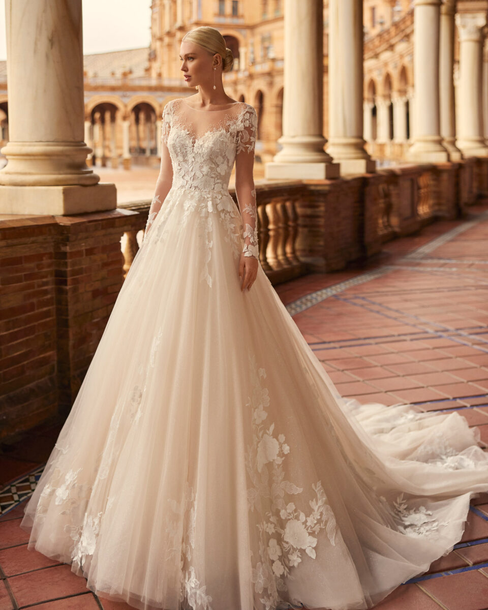 Robe de mariée, longue silhouette en ligne A. Confectionnée avec tulle, décolleté en coeur, manches longues amovibles