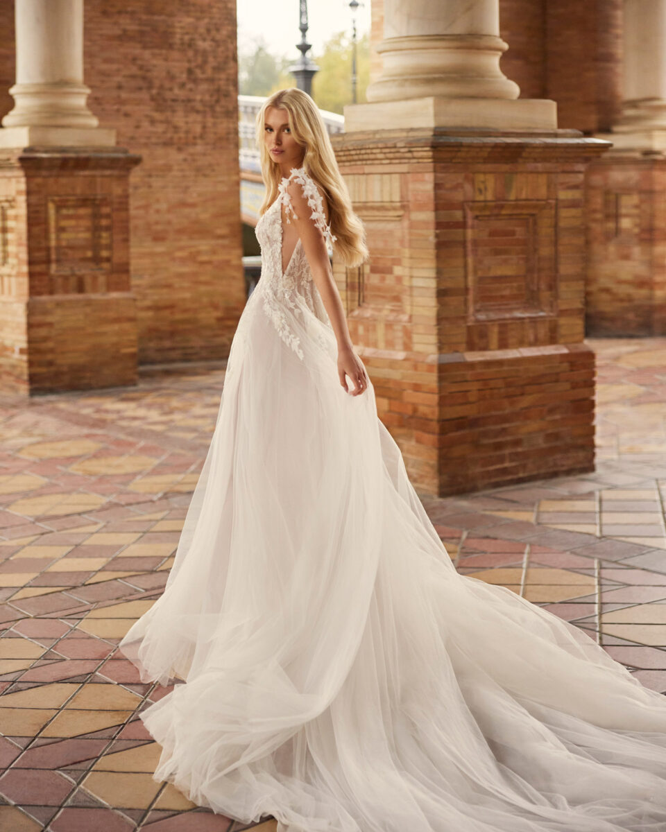 Robe de mariée, longue et droite. Confectionnée avec tulle, corsage perlé et bretelles ornées tombantes amovibles. Dos en V et jupe fendue sur le côté